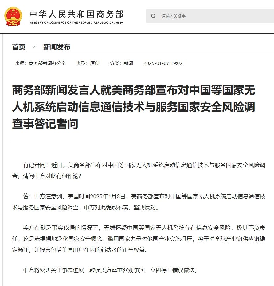 答:中方注意到,美国时间2025年1月3日,美商务部宣布对中国等国家无人机系统启动信息通信技术与服务国家安全风险调查。中方对此强烈不满,坚决反对。