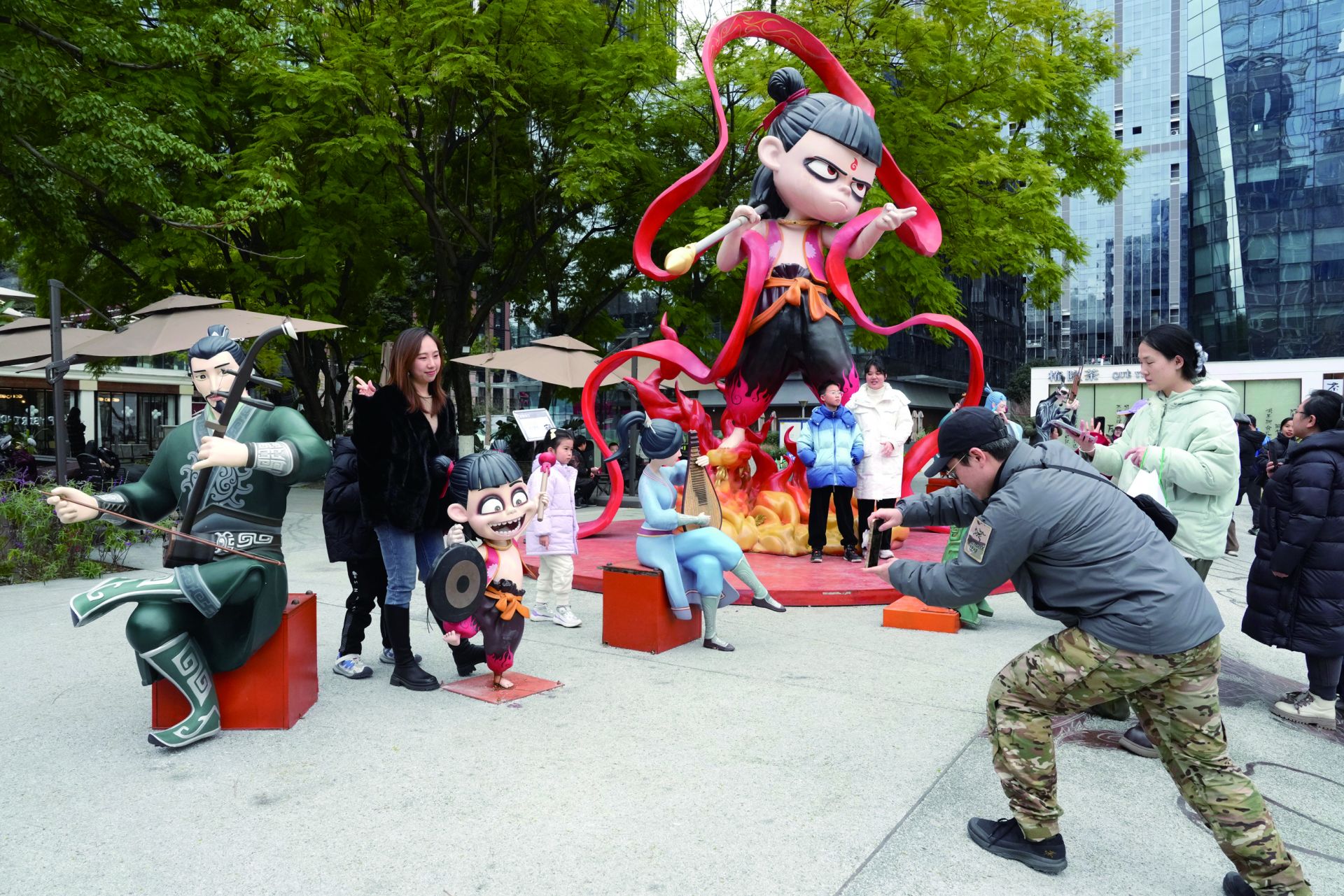2月6日,四川成都,民众在位于成都交子大道的哪吒塑像前拍照留念。当日,电影《哪吒之魔童闹海》总票房突破57.76亿元,登顶中国影史票房榜冠军。在成都街头的哪吒雕塑及电影制作公司可可豆动画所在地成为了网红打卡点。(安源摄)