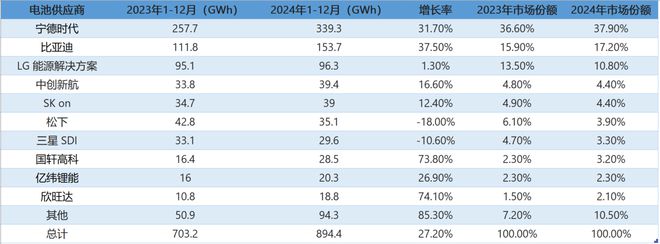 2024年全球动力电池装车量前十名