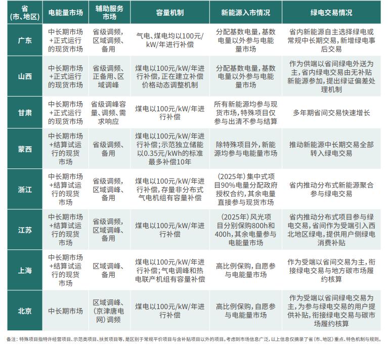 中国工业报记者获悉,报告详细梳理了包括广东、山西、甘肃、蒙西、浙江、江苏、上海、北京8个各具特色的典型省(市、地区)的绿色电力市场建设经验、理论逻辑和运作机制,总结了八省(市、地区)在电能量市场、辅助服务、容量、绿电交易等加速电力市场整体建设的特色机制。