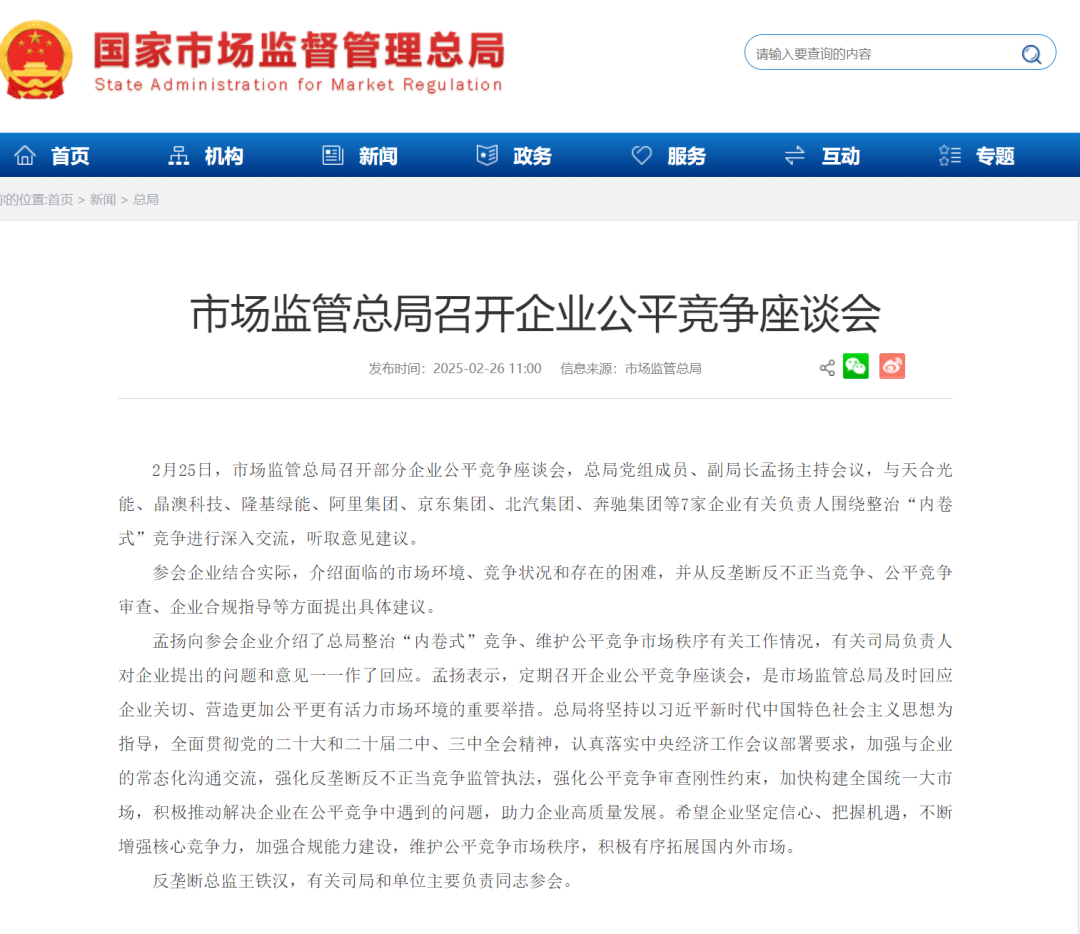 2月25日,市场监管总局召开部分企业公平竞争座谈会,总局党组成员、副局长孟扬主持会议,与天合光能、晶澳科技、隆基绿能、阿里集团、京东集团、北汽集团、奔驰集团等7家企业有关负责人围绕整治“内卷式”竞争进行深入交流,听取意见建议。