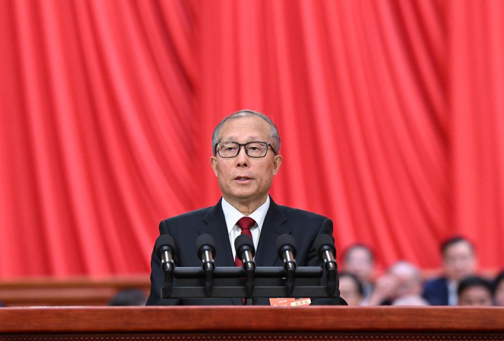 3月5日上午,第十四届全国人民代表大会第三次会议在北京人民大会堂开幕。受全国人大常委会委托,全国人大常委会副委员长李鸿忠作关于全国人民代表大会和地方各级人民代表大会代表法修正草案的说明。新华社记者张领摄