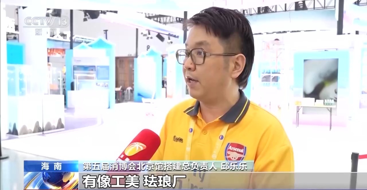 第五届消博会北京馆搭建总负责人邱乐乐:这次北京也带来25家企业,有像工美、珐琅厂、菜市口百货这些老企业,也有新媒体的企业。