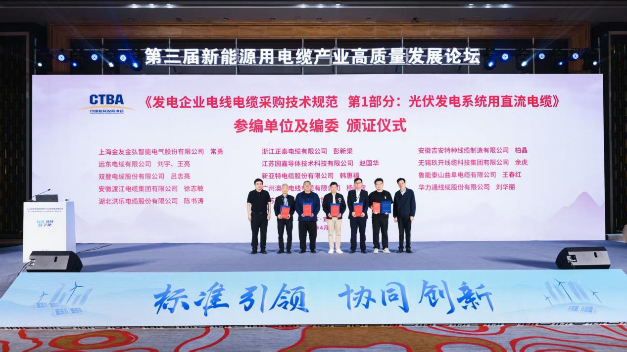近日,中国华能集团牵头,中国华电、中国大唐、国家电投、国家能源、中国能建、三峡集团、中国节能、京能集团、蒙能集团、中国宝武、中煤集团等央国企采购单位参编,中国招标投标协会(以下简称中招协)归口管理的团体标准《发电企业电线电缆采购技术规范第1部分:光伏发电系统用直流电缆》(以下简称《光伏电缆采购技术规范》)首发暨宣贯会议在江苏宜兴“第三届新能源用电缆产业高质量发展论坛”上举行。