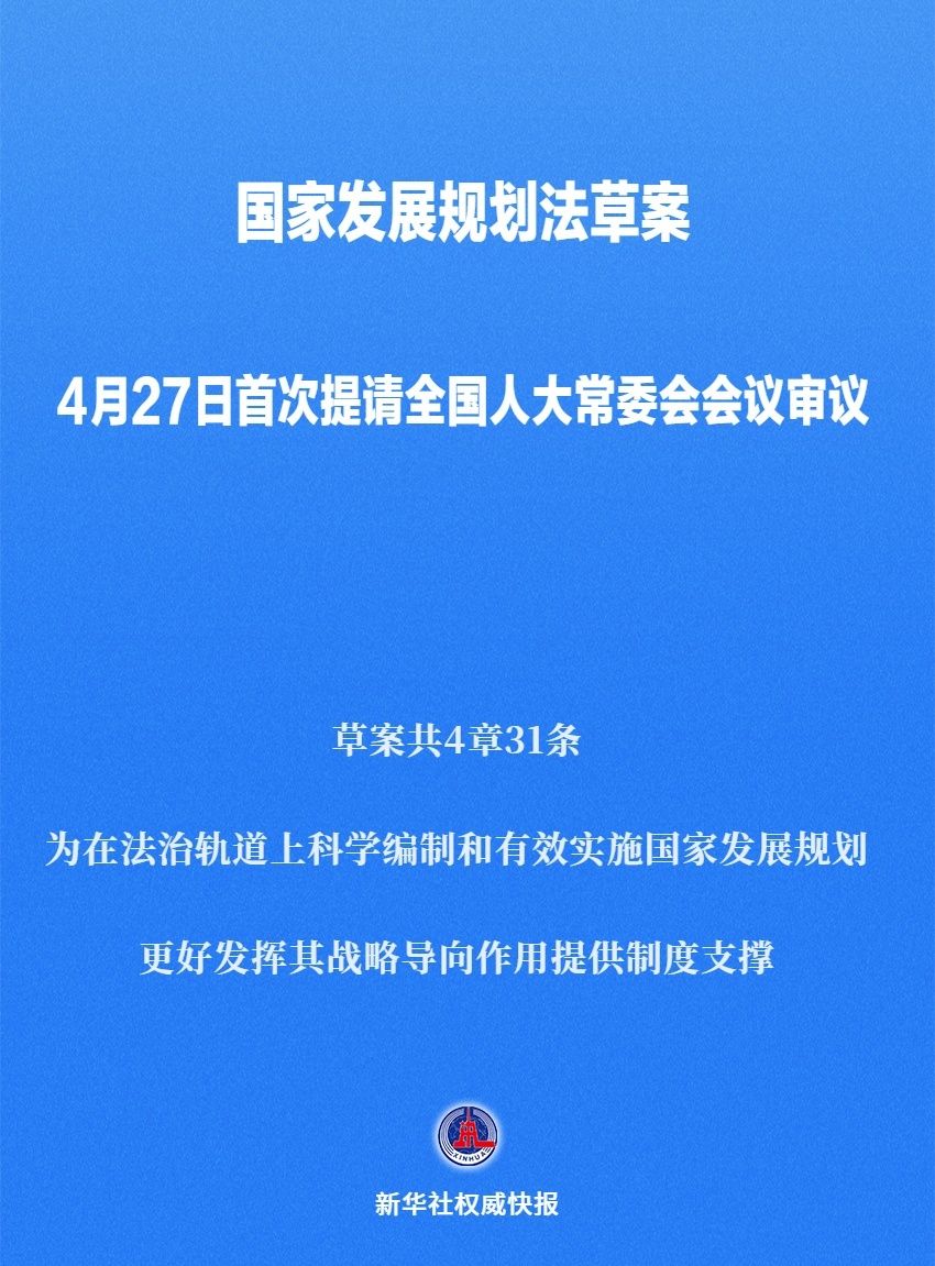 国家发展规划法草案4月27日首次提请全国人大常委会会议审议。草案共4章31条,主要包括总体要求、国家发展规划的制定、国家发展规划的实施等内容。
