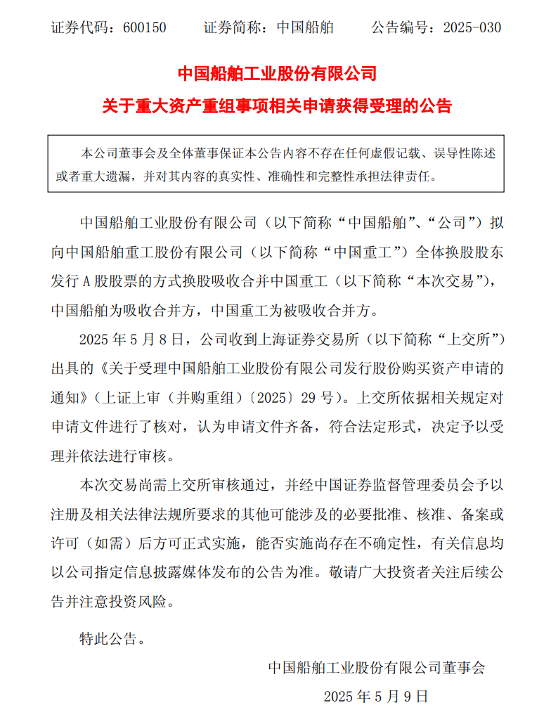 中国船舶公告称,中国船舶工业股份有限公司(以下简称“中国船舶”)拟向中国船舶重工股份有限公司(以下简称“中国重工”)全体换股股东发行A股股票的方式换股吸收合并中国重工(以下简称“本次交易”),中国船舶为吸收合并方,中国重工为被吸收合并方。5月8日,中国船舶收到上海证券交易所(以下称“上交所”出具的《关于受理中国船舶工业股份有限公司发行股份购买资产申请的通知》(上证上审(并购重组)(2025)29号)。上交所依据相关规定对申请文件进行了核对,决定予以受理并依法进行审核。