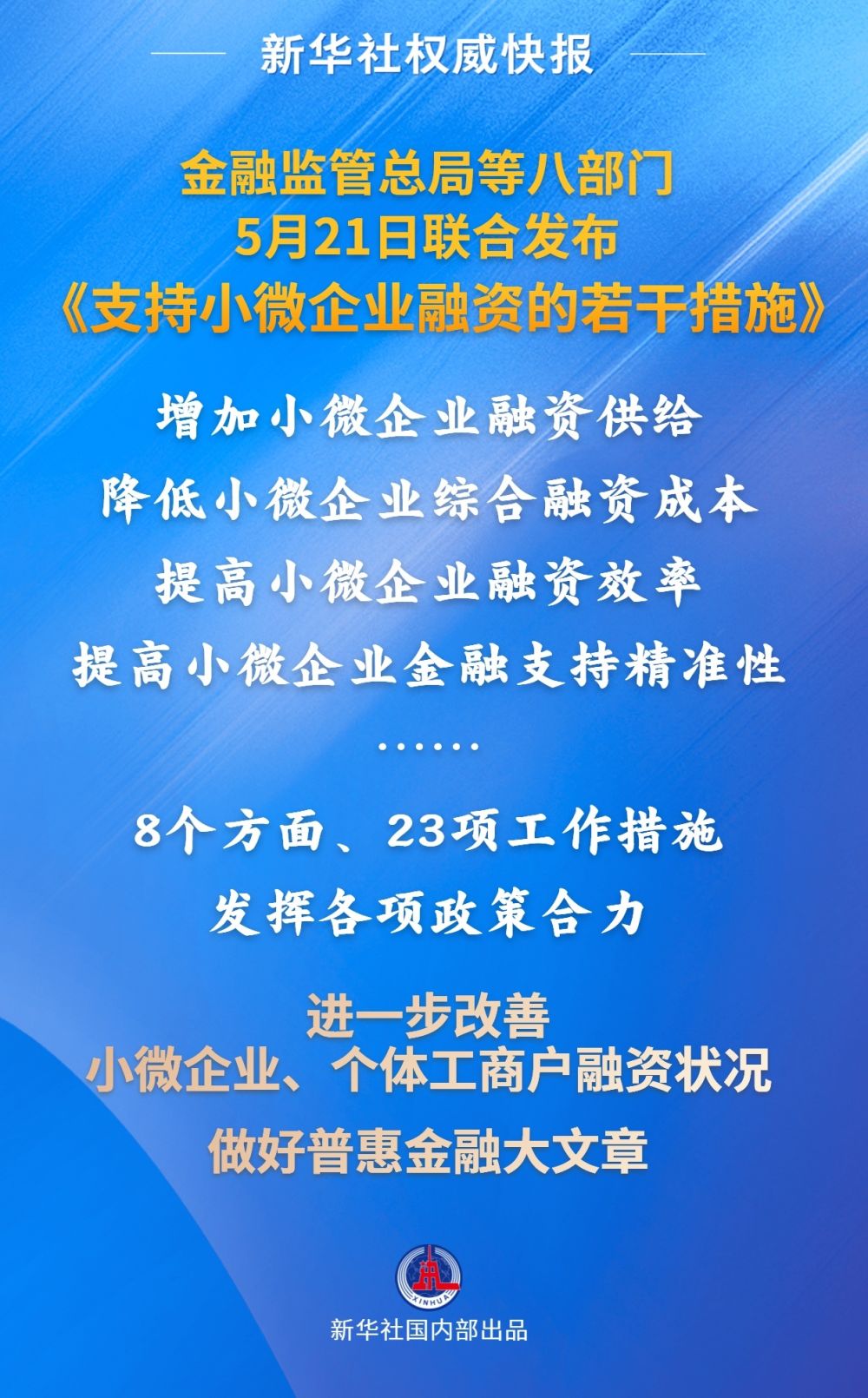 金融监管总局、中国人民银行、中国证监会、国家发展改革委、工业和信息化部、财政部、国家税务总局、市场监管总局5月21日联合发布《支持小微企业融资的若干措施》。