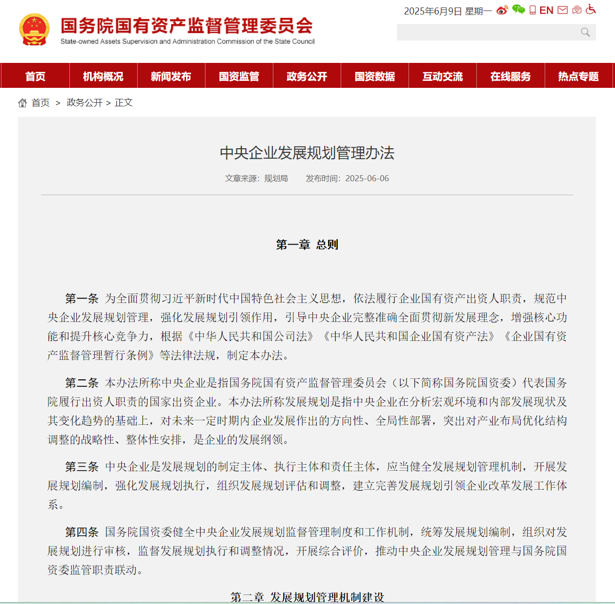 国务院国资委6月6日消息,国务院国资委近日印发《中央企业发展规划管理办法》(国务院国资委令第45号)(以下简称《办法》)。《办法》首次以制度形式明确建立国资央企三级规划体系,完善规划编制、执行、评估、调整、评价闭环管理工作机制。《办法》明确,中央企业董事长是发展规划管理第一责任人。《办法》规定,发展规划重点指标纳入中央企业负责人经营业绩考核范围,任期及年度经营业绩考核目标应当与发展规划目标值及其年度分解目标相衔接。