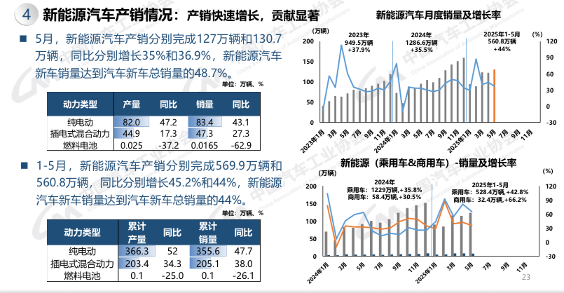 最大亮点来自新能源汽车:单月产销量127万辆和130.7万辆,环比增长1.5%和6.7%,同比猛增35%和36.9%;渗透率达48.7%。1-5月累计销售560.8万辆,同比增长44%,渗透率稳固在44%。
