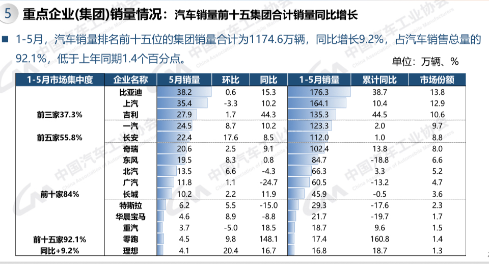 出口头部效应显著:奇瑞单月出口10.1万辆(同比+9%),稳居第一;比亚迪出口8.9万辆,同比飙升130%,增速领跑行业;前5月比亚迪累计出口38.2万辆,实现1.1倍增长。