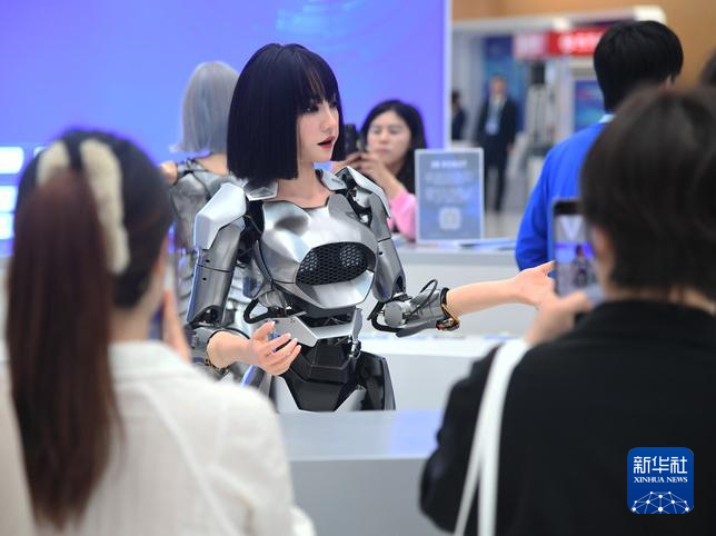仿生人形机器人在2024中关村论坛年会会场设置的咨询台“迎宾”(2024年4月27日摄)。新华社记者任超摄
