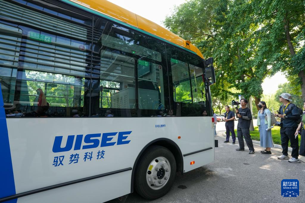参观者在北京驭势科技参观一款无人驾驶巴士(6月16日摄)。新华社记者鞠焕宗摄