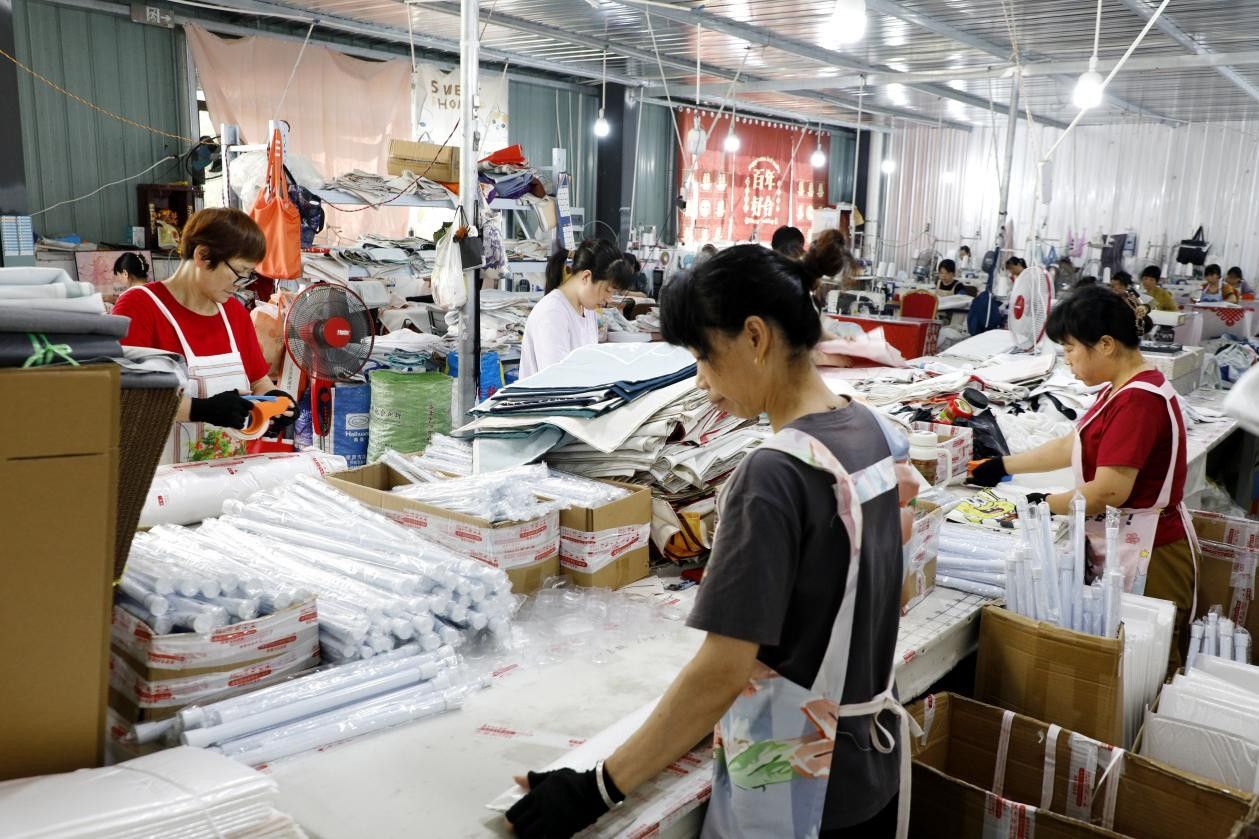 52岁的汪仙梅坐在缝纫机前,指尖翻飞间,一块布帘渐渐成型。她抹了把额头的汗,笑着说:“以前守着几亩薄田,一年到头攒不下几个钱。现在家门口上班,日子也越来越好了,这都是托了电商的福。”
