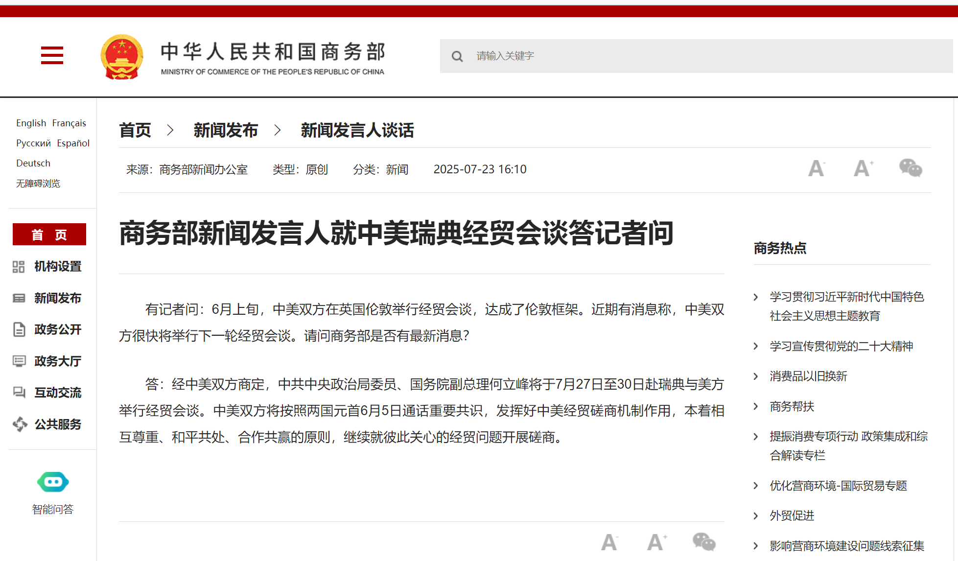 7月23日,商务部新闻发言人就中美瑞典经贸会谈答记者问。