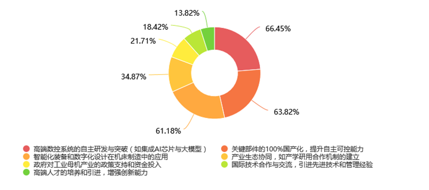 《研报》调研发现,超过60%的受访者认为,高端数控系统的自主研发与突破、关键部件的100%国产化以及智能化装备和数字化设计的应用对推动工业母机行业技术进步最为关键。