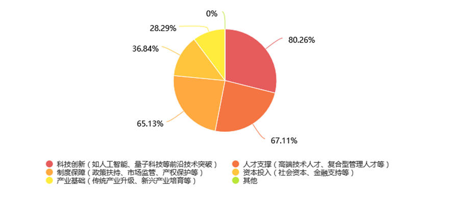 《研报》调研发现,“十五五”时期,发展新质生产力的最核心驱动要素是科技创新(80.26%),其次是人才支撑和制度保障(67.11%)。