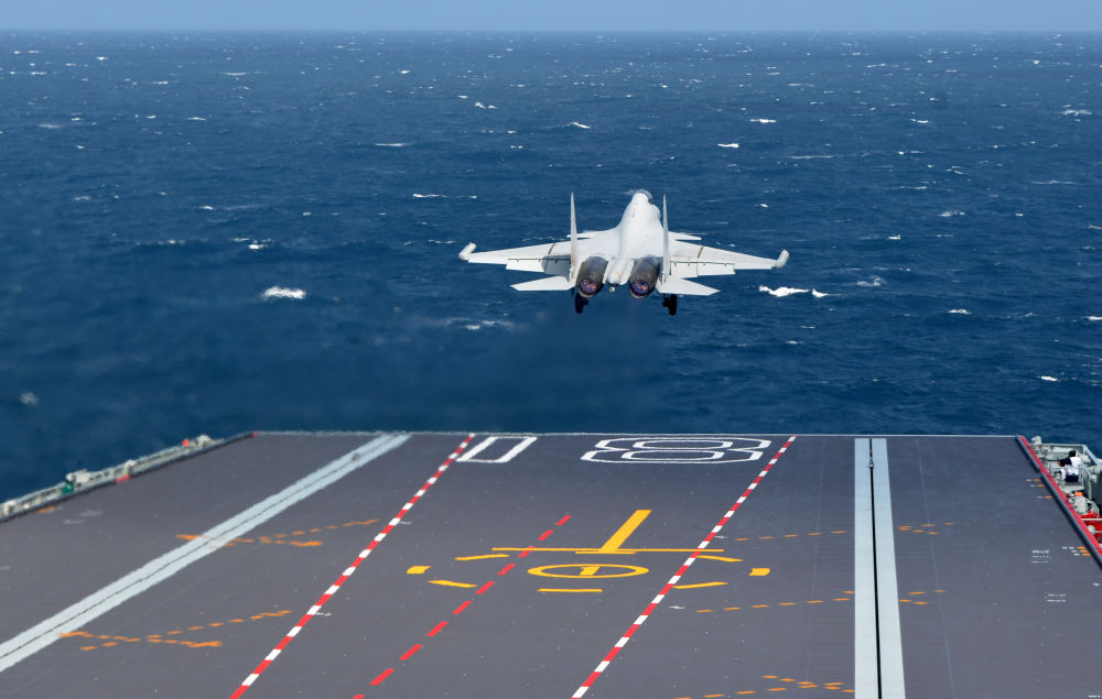 海军福建舰开展入列后首次海上实兵训练期间,歼-15DT舰载机弹射起飞(资料照片)。新华社发(高泽明摄)