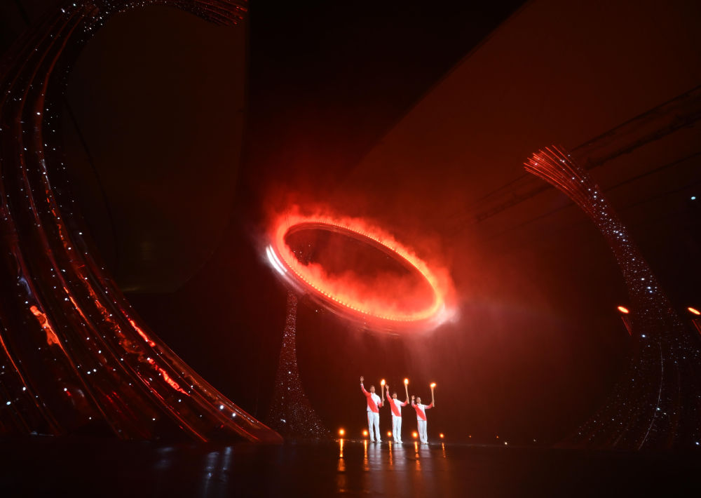 2025年11月9日,第十五届全国运动会开幕式在广东奥林匹克体育中心举行。这是火炬手苏炳添(中)、张家朗(左)、李祎点燃主火炬后向观众致意。新华社记者肖艺九摄