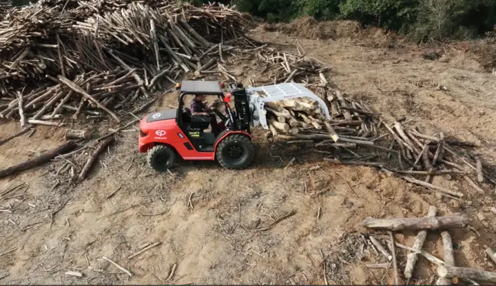 泥泞、陡坡、砂土?四驱电动越野叉车终结木业搬运难题!