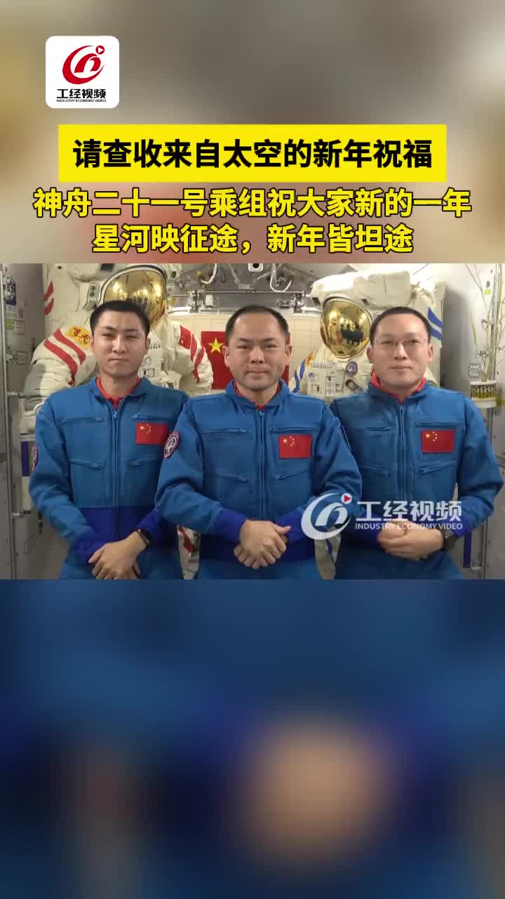 请查收来自太空的新年祝福,神舟二十一号乘组航天员张陆、武飞、张洪章送上2026新年祝福:祝大家新的一年,星河映征途,新年皆坦途,新年快乐!#神舟二十一号 #2026新年快乐