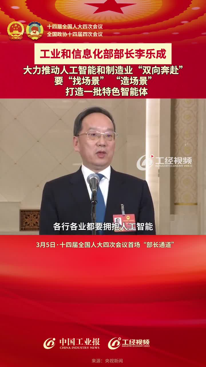 工业和信息化部部长李乐成:大力推动人工智能和制造业“双向奔赴” ,要“找场景” “造场景” ,打造一批特色智能体 #2026全国两会 #中国工业报两会时间 #部长通道 #人工智能