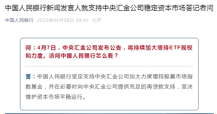 当日尾盘时分,中央汇金发布公告称,坚定看好中国资本市场发展前景,充分认可当前A股配置价值,并表示已再次增持ETF,未来将继续增持