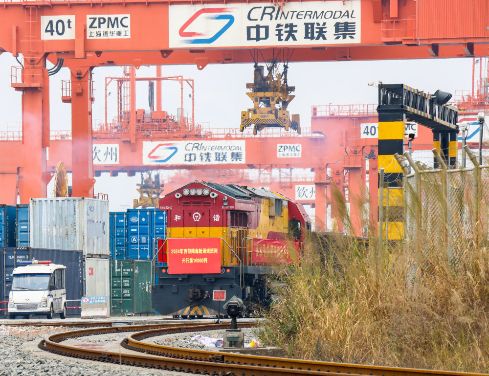 这是2024年西部陆海新通道班列开行的第10000列,班列年度开行量首次突破万列,同比增长5.1%