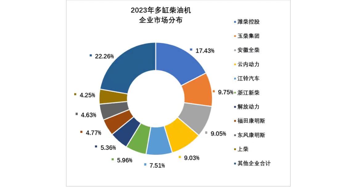 12月,多缸柴油机企业共销量34.07万台,环比增长-3.97%,同比增长28.63%;全年销量413.39万台,同比增长10.89%。潍柴、玉柴、全柴、云内、江铃、新柴、解放动力、福康、东康、上柴销量居前十名,占多缸柴油机总销量的77.74%;市场份额占比中:潍柴17.43%、玉柴9.75%、全柴9.05%、云内9.03%、江铃7.51%、新柴5.96%、解放动力5.36%、福康4.77%、东康4.63%、上柴4.25%。