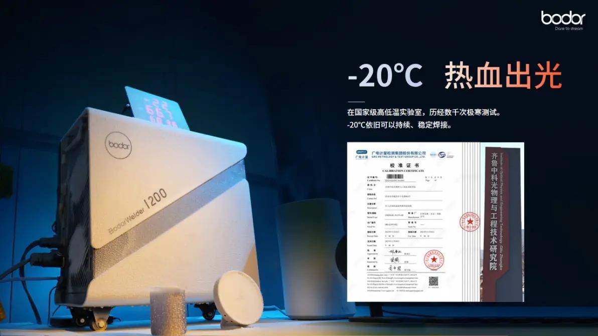 在国家级高低温实验室,邦德激光自冷却手持激光焊在数千次高温、极寒测试中表现出绝佳性能:40℃高温环境下,光束质量持续高能,出光依旧平稳、强劲;-20℃极寒环境下,无需提前预热,开机即刻高质量出光,同样具备强劲的稳定性、持续性。这说明,无论任何季节,邦德激光自冷却手持激光焊都能“大显身手”,免除用户的后顾之忧。