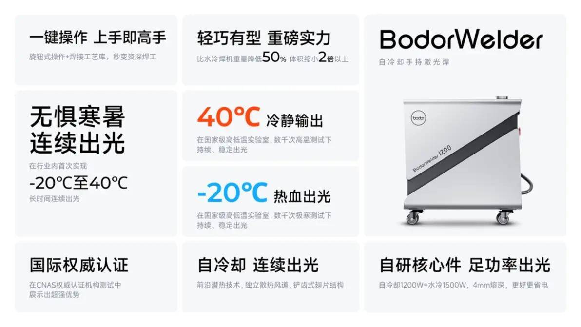 邦德激光BodorWelder自冷却手持激光焊,革命性地解决了以往风冷焊接因受散热影响而间歇性停光冷却的传统问题,以自研智控环流恒温技术,在行业内首次实现-20℃至40℃长时间连续出光,带来极具革命性的焊接体验及焊接效果,开启风冷焊接连续出光新时代。