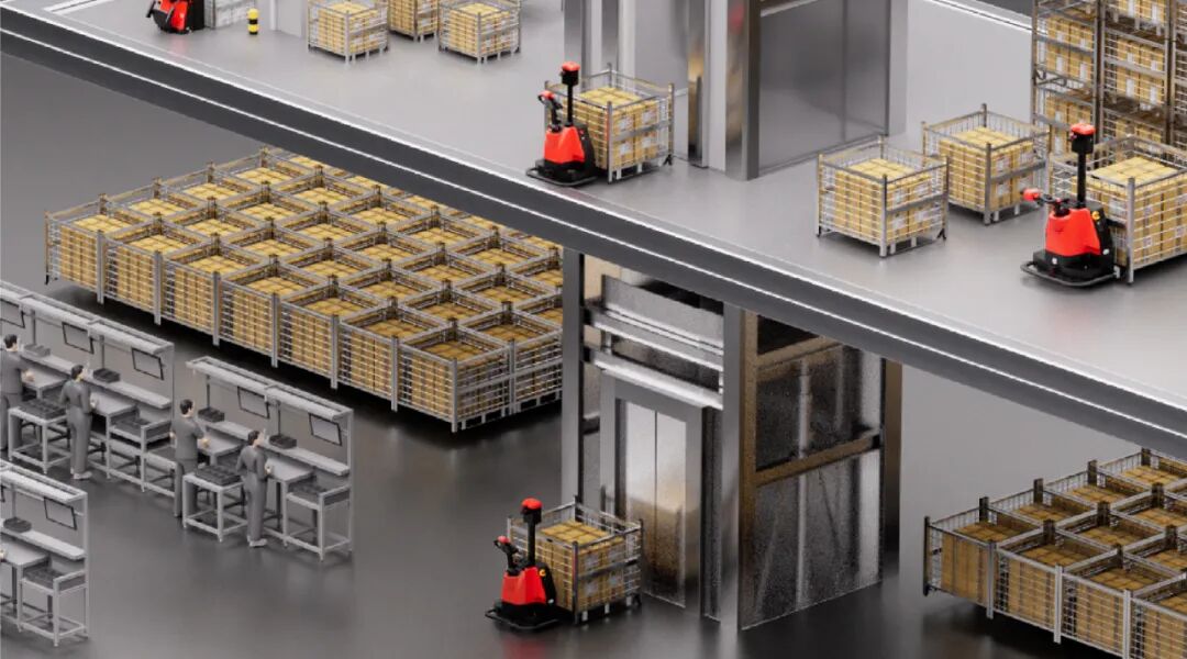 需及时补充产线物料,该客户引进中力跨楼层自动搬运车后完全代替传统人工往返搬运,自行呼叫电梯,安全上下电梯,完成跨楼层物料及时转运。