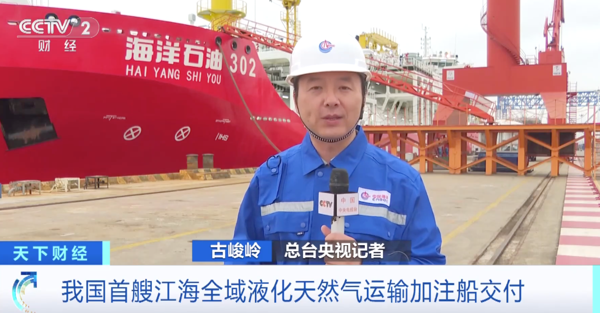 总台央视记者古峻岭:“海洋石油302”船是刚刚建成交付的我国首艘江海全域、冬夏全季的液化天然气运输加注船。它的甲板面积超过了一个标准的足球场,储气舱容量达到了12000立方米,可以满足48万户家庭一个月的用气需求。这艘加注船最高加注速度可达2000立方米/小时,它能够在短时间内完成大型液化天然气燃料船的加注任务,是一座名副其实的“水上移动加气站”。