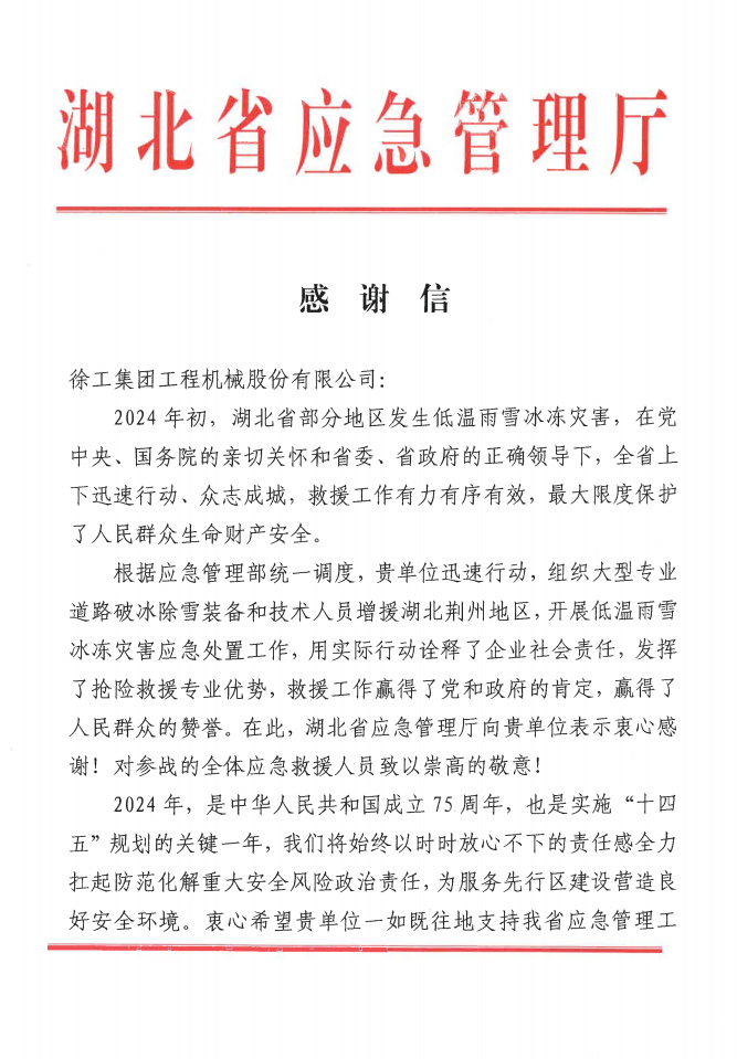 此外,徐工还收到了来自湖北省应急管理厅一封特殊的感谢信。对徐工2024年初,面对低温雨雪冰冻灾害,迅速组织道路破冰除雪装备和技术人员增援湖北荆州地区表示感谢。