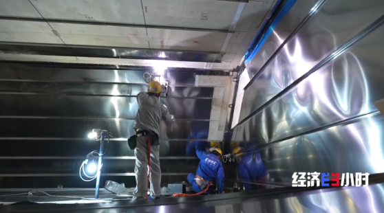 液货舱的内壁就是由一块块的殷瓦钢焊接组合起来,普遍的厚度只有0.7毫米,焊接也是货舱建造难度最大的部分。工程师们不断创造焊接纪录,缩短施工时间,将原来大约18个月的码头周期逐步缩短至现在的7个月。