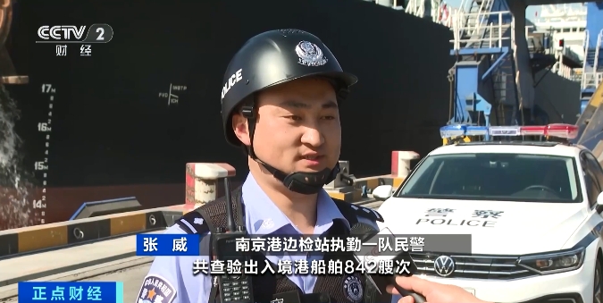 南京港边检站执勤一队民警张威:今年1月至4月,南京港边检站共查验出入境港船舶842艘次,同比增长10.2%,为船方和码头企业节省通关时间1000多个小时。