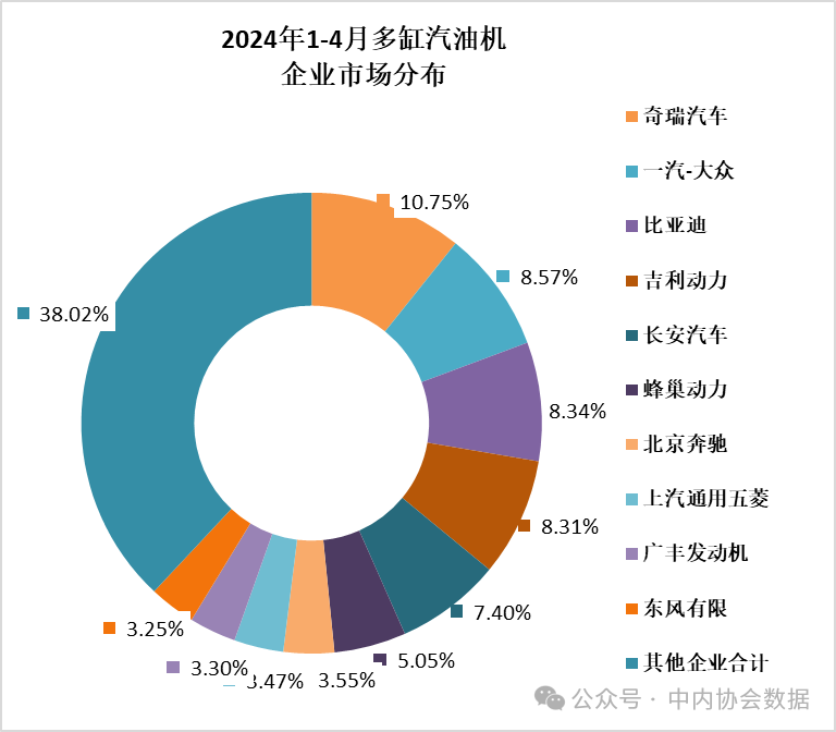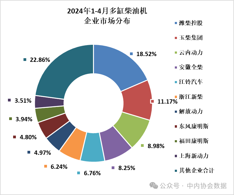 4月,多缸柴油机企业共销量37.81万台,环比增长-17.28%,同比增长-1.02%;1-4月累计销量150.36万台,同比增长-1.11%。潍柴、玉柴、云内、全柴、江铃、新柴、解放动力、东康、福康、上海新动力销量居前十名,占多缸柴油机总销量的77.14%;市场份额占比中:潍柴18.52%、玉柴11.17%、云内8.98%、全柴8.25%、江铃6.76%、新柴6.24%、解放动力4.97%、东康4.80%、福康3.94%、上海新动力3.51%。4月,商用车用多缸柴油机销量18.62万台,环比增长-15.46%,同比增长5.19%,1-4月累计销量73.62万台,同比增长7.82%。销量前十的为潍柴、江铃、云内、玉柴、福康、解放动力、江淮、东康、全柴、欧康动力,其前十名销量占总销量89.96%;潍柴在商用车用多缸柴油机市场占据领先占比22.27%、江铃13.80%、云内10.26%、玉柴9.00%、福康8.05%、解放动力6.63%、江淮5.22%、东康5.22%、全柴4.99%、欧康4.51%。4月,工程机械用多缸柴油机销量8.03万台,环比增长-15.52%,同比增长5.38%;1-4月累计销量30.48万台,同比增长-7.72%。销量前十的为新柴、全柴、潍柴、云内、玉柴、东康、卡特彼勒、广康、解放动力、上海新动力,其前十名销量占其总销量97.02%。多缸汽油机乘用车市场4月产销环比下降,同比、累计同比增长,受其影响主要配套乘用车市场的多缸汽油机销量也呈趋同走势。