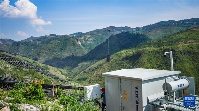 在盘江百万千瓦级光伏基地,无人机在调运光伏板(5月23日摄)。新华社记者陶亮摄