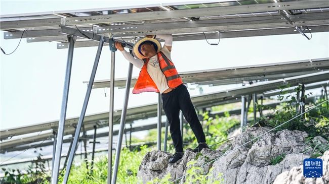 在盘江百万千瓦级光伏基地,贵州能源集团的工人在维修并安装光伏板(5月23日摄)。新华社记者陶亮摄