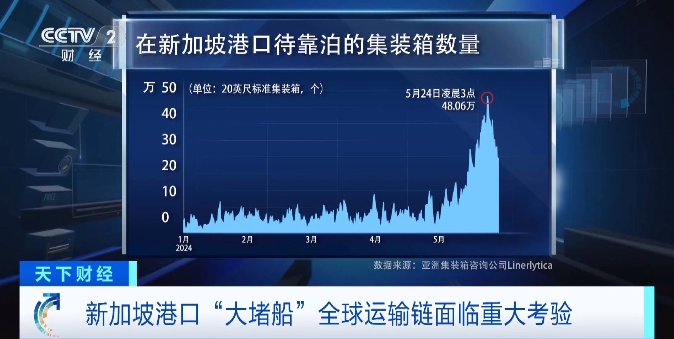 最新数据显示,5月在新加坡等待靠泊的集装箱数量出现了激增,在5月下旬的高峰时期,最高等待靠泊的集装箱数量曾达到48.06万个20英尺的标准集装箱。