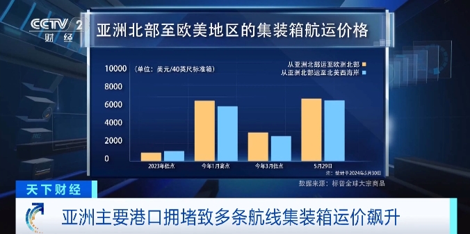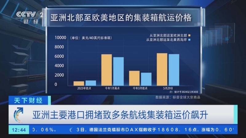 标普全球的最新报告显示,亚洲主要港口特别是新加坡的拥堵,也导致了集装箱航运价格的上涨。据统计,截至5月30日,目前亚洲到欧洲航线的运费达到了每40英尺集装箱6200美元,而亚洲到北美西海岸的运费也攀升至了6100美元。