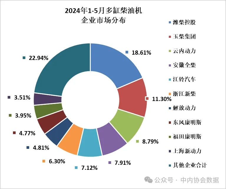5月,多缸柴油机企业共销量32.41万台,环比增长-14.29%,同比增长1.37%;1-5月累计销量182.77万台,同比增长-0.68%。潍柴、玉柴、云内、全柴、江铃、新柴、解放动力、东康、福康、上海新动力销量居前十名,占多缸柴油机总销量的77.06%;市场份额占比中:潍柴18.61%、玉柴11.30%、云内8.79%、全柴7.91%、江铃7.12%、新柴6.30%、解放动力4.81%、东康4.77%、福康3.95%、上海新动力3.51%。
