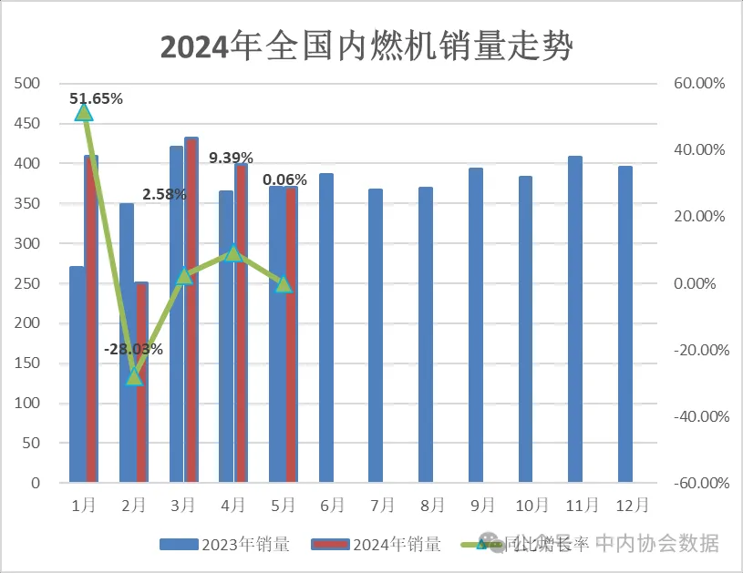 中国内燃机工业协会最新数据显示,2024年5月内燃机行业销量环比下降,同比基本持平,1-5月累计销量同比增幅小幅回落。5月,在设备更新和消费品以旧换新政策推动下,各行业发展平稳,但当前国内的消费增长相对缓慢,行业竞争激烈,总体运行依然面临较大压力。5月的内燃机市场表现相对平稳,销量同比基本持平,累计同比增幅小幅回落。具体表现为:5月内燃机销量370.04万台,环比增长-7.07%,同比增长0.06%;1-5月累计销量1859.94万台,同比增长4.91%。(较1-4月涨幅减少1.28个百分点)终端方面,乘用车市场继续保持良好势头,商用车持续缓慢回升,农机、工程等市场销量形势依然较为严峻。销量总体概述:5月,内燃机销量370.04台,环比增长-7.07%,同比增长0.06%;功率完成22070.33万千瓦,环比增长-7.77%,同比增长-6.56%。1-5月累计销量1859.94万台,同比增长4.91%;累计功率完成113692.20万千瓦,同比增长2.99%。