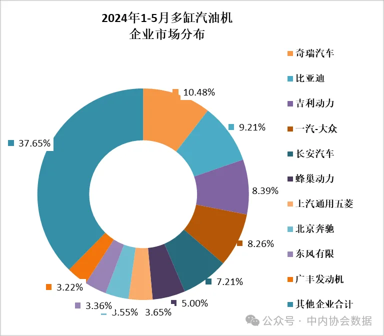 5月多缸汽油机销量147.10万台,环比增长-7.09%,同比增长-8.01%;1-5月累计销量741.75万台,同比增长2.68%。在45家多缸汽油机企业中奇瑞、比亚迪、吉利、一汽-大众、长安汽车、蜂巢动力、上通五菱、北京奔驰、东风有限、广丰发动机销量排在前列,占总销量的62.35%。在销量较多的企业中,奇瑞、比亚迪、吉利、蜂巢动力累计销量增势表现突出。乘用车用在多缸汽油机占比为97.50%,5月销量142.90万台,环比增长-7.94%,同比增长-7.85%;1-5月累计销量723.25万台,同比增长3.76%。奇瑞、比亚迪、吉利、一汽-大众、长安汽车、蜂巢动力、上通五菱、北京奔驰、东风有限、广丰发动机销量排在前列。小汽油机行业主要做进出口贸易,受内外部环境影响明显导致波及较大。在可比口径中,5月小汽油机销量环比下降,同比及累计同比增长。5月小汽油机销量62.75万台,环比增长-10.48%,同比增长35.42%;1-5月累计销量333.81万台,同比增长14.74%。销量前五名企业为润通、隆鑫、华盛、力帆内燃机、苏州双马。在配套农业机械中,5月销量22.99万台,环比增长-3.33%,同比增长44.69%。1-5月累计销量130.98万台,同比增长25.58%在配套园林机械领域中,5月销量10.74万台,环比增长-18.39%,同比增长-9.96%;1-5月累计销量62.98万台,同比增长-11.83%。
