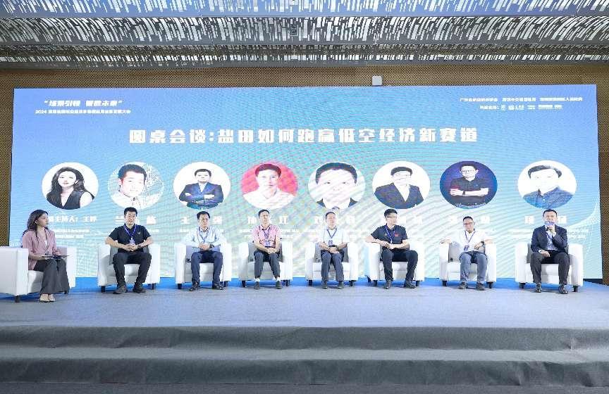 在圆桌对话环节,主办方邀请了北京航空航天大学深圳研究院院长、深圳市低空经济产业协会副会长刘荣科,北京理工大学珠海学院航空学院院长、珠海市通用航空协会会长孙长江,哈尔滨工业大学(深圳)空间科学与应用技术研究院副教授禹智斌,西北工业大学深圳研究院无人系统实验室主任王强,中山大学教授、飞行器领域学术带头人张邦楚,中国城市经济研究院低空产业发展研究中心主任项征,青岛云世纪信息科技有限公司创始人兰玉栋,共同探讨盐田如何在低空经济新赛道中跑赢对手。嘉宾们从各自的实践经验和优秀案例出发,分享了低空经济赋能各产业的探索与成果,既有经验交流,又有行业未来的探讨,带来了一场具有丰富层次的思想盛宴。