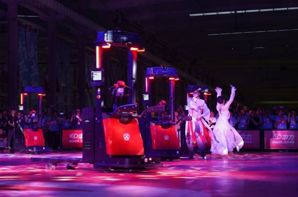 一曲人机共舞的《梁祝搬马机器人》节目扬名行业内外,让大众看见机器人的无限魅力。本次活动现场,这一名场面再次上演,梁祝经典乐曲响彻全场,中力物流专用高速搬运机器人伴随着柔美舞者或急或徐,优美律动,共同上演一场视觉盛宴!