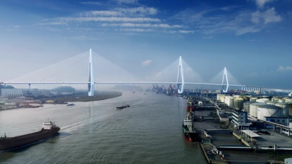 跨港区及甬江特大桥为三塔双索面钢混组合梁斜拉桥,主跨布置为540+570米。大桥索塔设计为钻石型,高217.5米,由下塔柱、中塔柱、塔冠、下横梁组成,拟划分为39个节段,采用液压爬模系统施工。