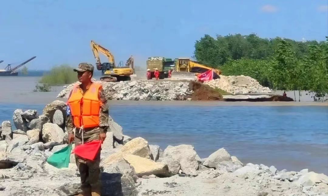 救灾现场,徐工挖掘机正加紧施工,在决口两端建设倒车平台,并在决口两端倾倒大型石块,建设“裹头”,减缓水流对决口冲刷,防止决口扩大,并进行后续的堵口作业。