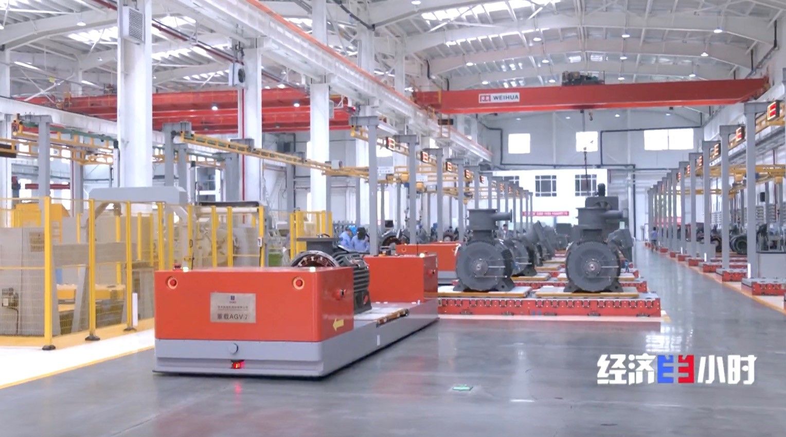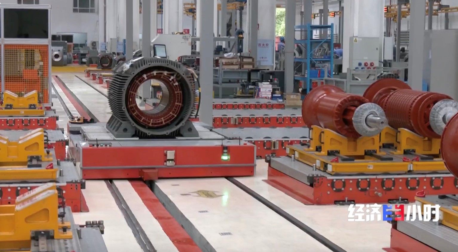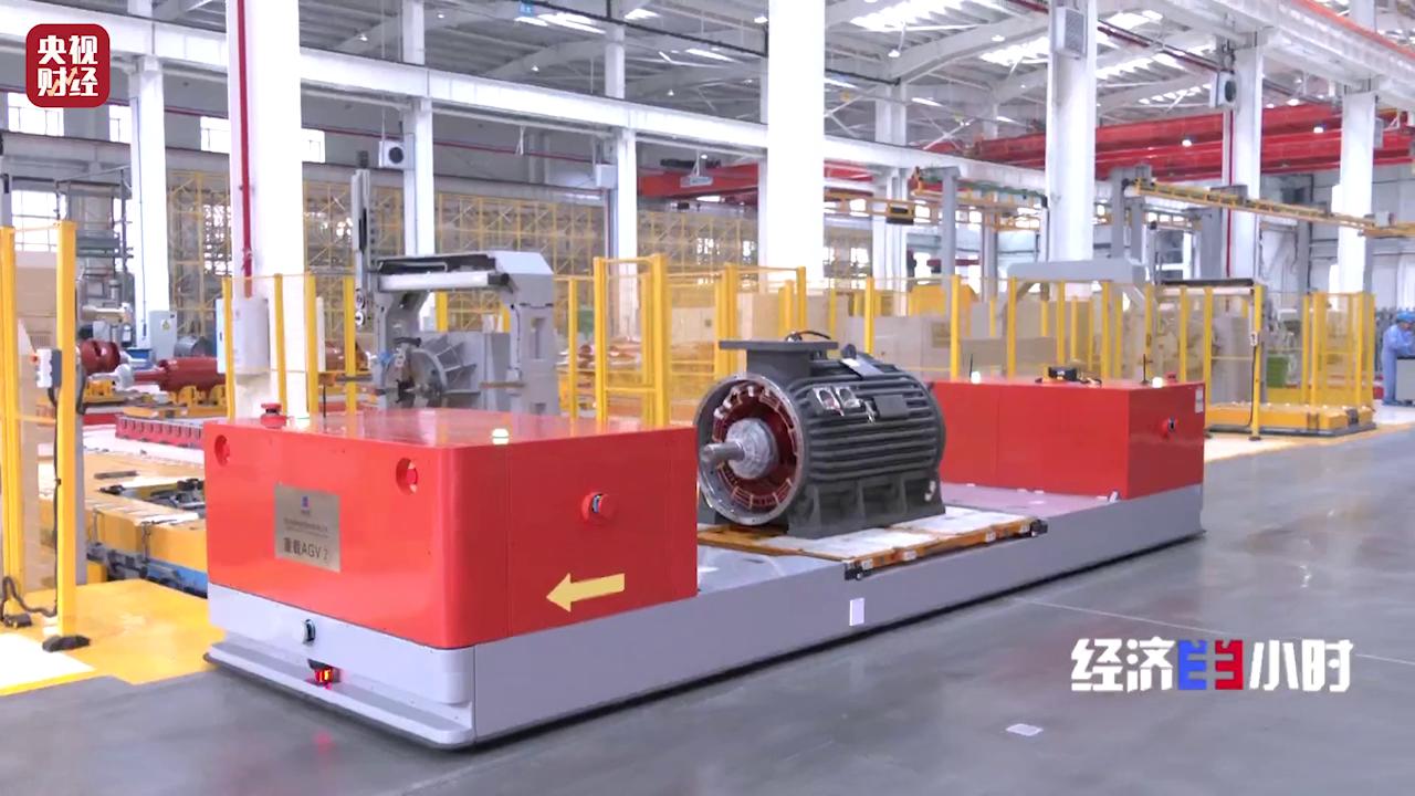 在高压电机数字化装配车间,配备了多种类型的智能无人化运输和装配加工设备,柔性化的设计,能够满足从小到大1200多种不同规格的电机产品装配需求。