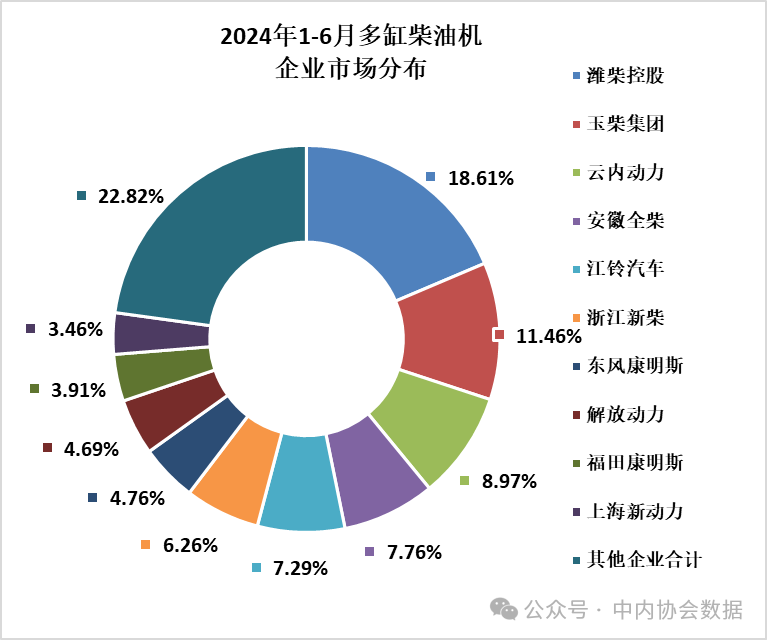 6月,多缸柴油机企业共销量31.11万台,环比增长-4.01%,同比增长-1.97%;1-6月累计销量213.88万台,同比增长-0.87%。潍柴、玉柴、云内、全柴、江铃、新柴、东康、解放动力、福康、上海新动力销量居前十名,占多缸柴油机总销量的77.18%;市场份额占比中:潍柴18.61%、玉柴11.46%、云内8.97%、全柴7.76%、江铃7.29%、新柴6.26%、东康4.76%、解放动力4.69%、福康3.91%、上海新动力3.46%。6月,商用车用多缸柴油机销量15.23万台,环比增长-4.74%,同比增长-7.67%,1-6月累计销量104.83万台,同比增长4.26%。销量前十的为潍柴、江铃、云内、玉柴、福康、解放动力、江淮、东康、欧康动力、全柴,其前十名销量占总销量90.09%;潍柴在商用车用多缸柴油机市场占据领先占比22.03%、江铃14.87%、云内10.16%、玉柴9.02%、福康7.98%、解放动力6.43%、江淮5.15%、东康4.99%、欧康4.83%、全柴4.63%。6月,工程机械用多缸柴油机销量6.51万台,环比增长-2.73%,同比增长-0.29%;1-6月累计销量43.68万台,同比增长-5.12%。销量前十的为新柴、全柴、潍柴、云内、玉柴、卡特彼勒、东康、广康、解放动力、上海新动力,其前十名销量占其总销量96.87%。多缸汽油机乘用车市场6月产销环比增长,同比下降,累计同比增长,受其影响主要配套乘用车市场的多缸汽油机销量也呈趋同走势。