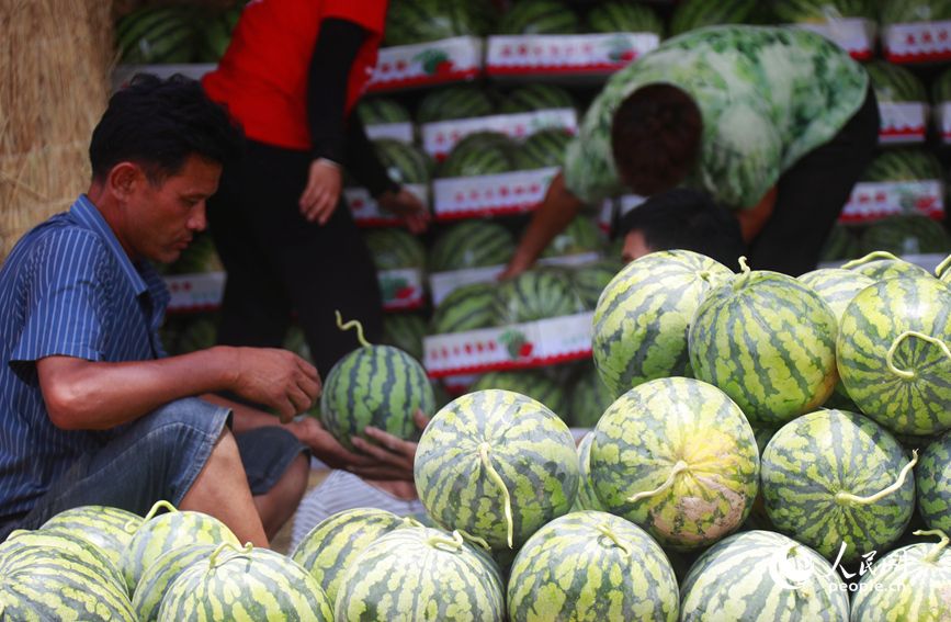 村民将西瓜装车外运。